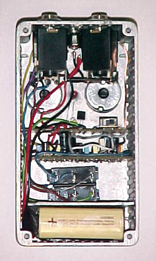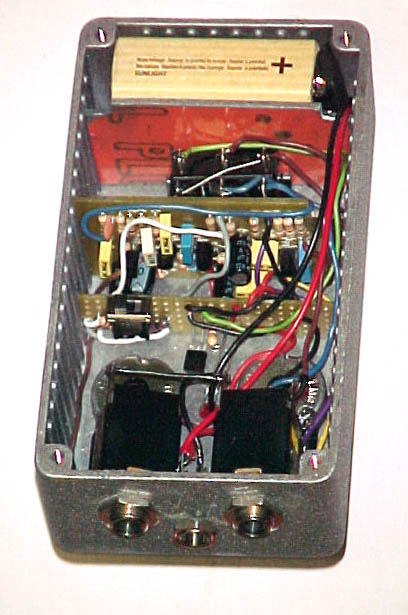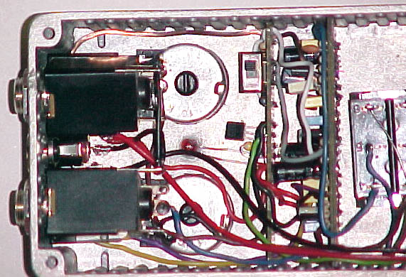 Con este circuito también utilicé el método de prototipos con la placa "enchufable" esa que habéis visto en otros proyectos anteriores. El caso es que cuando ya obtuve el circuito funcionando me puse a jugar con las resistencias de "bias" de los transistores y llegué a una combinación curiosa que me pareción interesante añadir. Para realizarla opté por una segunda placa "auxiliar" dentro de la caja que iba a alojar el circuito "Millenium-2" para poder tener LED de in/out al tiempo que "True ByPass" con un conmutador DPDT (lo que es totalmente innecesario hoy en día con los conmutadores de pie del tipo 3PDT) y además un pequeño conmutador SPDT (un circuito, dos posiciones), que es al que se refería Lapsteel en su nota. Lo malo es que para entonces, Rubén ya había hecho las cajas y no había modo "decente" de poner el conmutador por fuera de la caja.