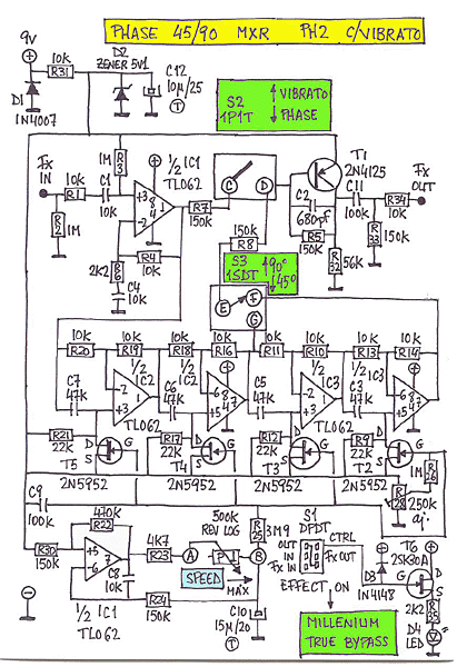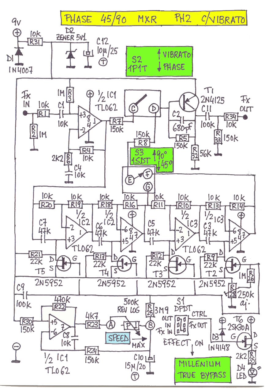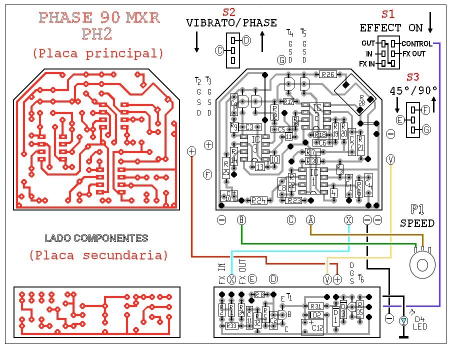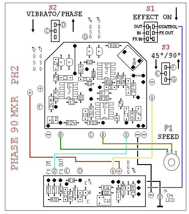 La primera es que, con un simple conmutador 1PDT, podemos conseguir el Phase 90 o el Phase 45. Ambos circuitos son muy similares. La diferencia está en que el Phase 90 tiene 4 etapas de desfase de señal y el Phase 45 sólo tiene dos. Como podéis ver en el esquema, cuando las patas E y F del conmutador S3 están conectadas, tenemos el Phase 90. Cuando E se une con G (punto de salida de la segunda etapa de desfase), tenemos el Phase 45. Ambas posiciones suenan muy bien, aunque en el Phase 90 el efecto es mucho más profundo.