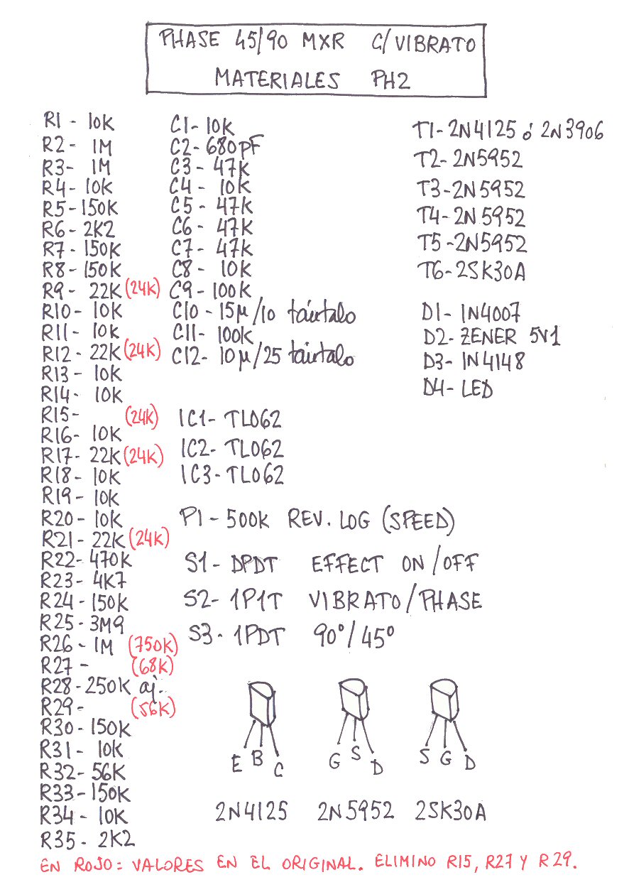 Ahora vamos con algunas salvedades. En primer lugar, se oye un ruido que no se puede calificar de "pop" sino más bien de "KROK" cuando accionamos tanto S2 (vibrato) como S3 (Phase 45/90) con el efecto conectado. La solución es que cambiemos de posición los conmutadores con el efecto en bypass. Se ve que T1 tiene la base muy sensible y le sienta como el culo que se la vayamos toqueteando. Para este transistor podemos usar tanto el 2N4125 como el 2N3906, el 2N5087, SC157 o el BC557 teniendo en cuenta, como es natural, los distintos encapsulados.