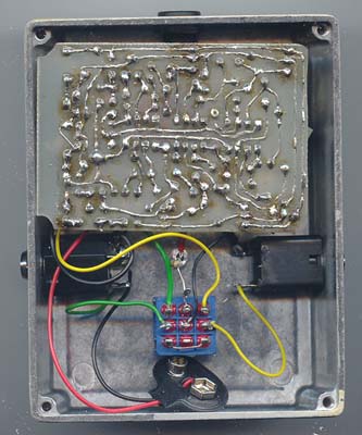 Otro asuntillo peliagudo es que el circuito no me cabía en una caja Retex i413. He usado una Hammond tipo B para el primer clon (se puede ver en la foto que he dejado hueco para la pila, aunque ya sabéis mi opinión sobre la alimentación. También se puede ver la cagada que hice con la pintura (foto inicial) ya que cuando le puse la laca transparente la tinta de las letras no se había secado del todo) y una Hammond BB, hermosota y grande ella, para el segundo. El primero lleva el circuito separado en las dos placas de que os he hablado. El segundo lleva una copia descarada de la placa del pedal original.