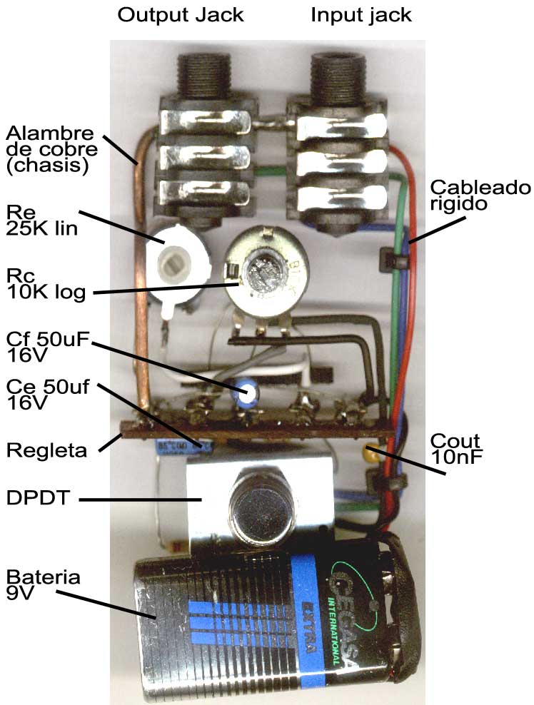 Busca un trozo grueso de alambre de cobre, toma medidas, dale forma y construye un chasis que una los dos jacks con la primera pata de la derecha de la regleta con un buen punto de soldadura, que será el punto común o masa del aparato (usa un soldador algo potente para soldar el alambre). He usado cables rígidos de colores para interconectar el resto de los componentes. Si te esmeras un ratillo en doblarlos a medida, soldarlos bien y luego atarlos firmemente, obtendrás un conjunto que se sostendrá por sí solo sin necesidad de alojarlo en una caja. El tema adquiere rigidez y fortaleza. Al final, suelda los componentes pequeños (transistor, resistencias, trimmers, condensadores, etc.) y listo. En el artículo PDF de Geo-Fex, en las páginas finales, viene una descripción paso a paso de como y donde soldar los componentes a la regleta.