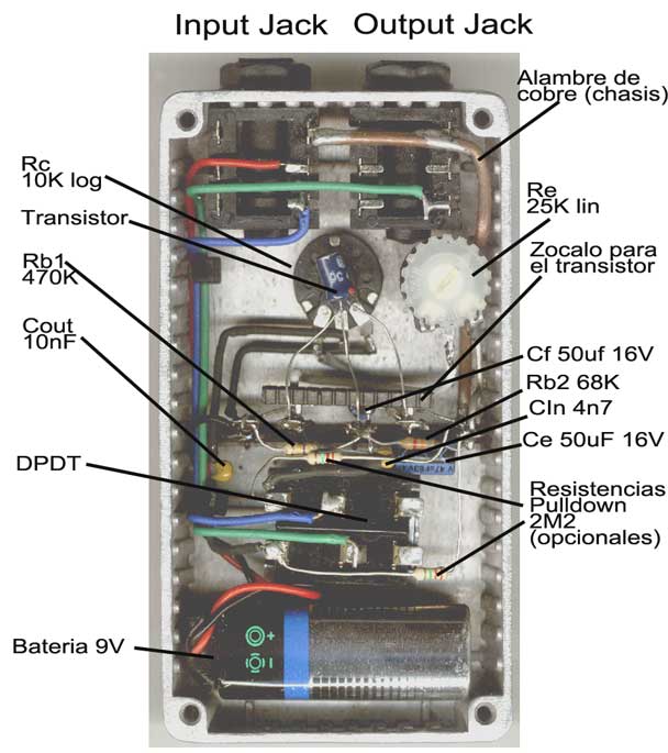 Reparabilidad y modificabilidad: Pues eso, que al estar todo a la vista, si se avería tardas 10 minutos en repararlo. Si quieres modificar algo, está todo al alcance, en la misma punta del soldador. Observad que he usado un zócalo para el transistor. Si tenéis varios, es conveniente disponer de este sistema para intercambiar los transistores con facilidad, para seleccionar el que mejor suene. Conviene también seleccionar el valor del condensador de entrada para tener la respuesta en frecuencia adecuada de un "treble booster". Nunca están de más unas resistencias pull-down para evitar el molesto "pop" al conmutar. Por lo demás, el efecto está construido siguiendo las instrucciones del artículo de Geo-Fex.