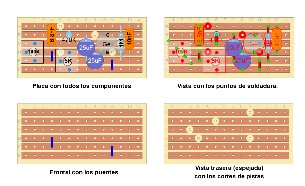 Si preferís hacerlo en placa de tiras tipo "VERO" aquí tenéis el diseño completo y con el esquema ya incluyendo los trimmers: