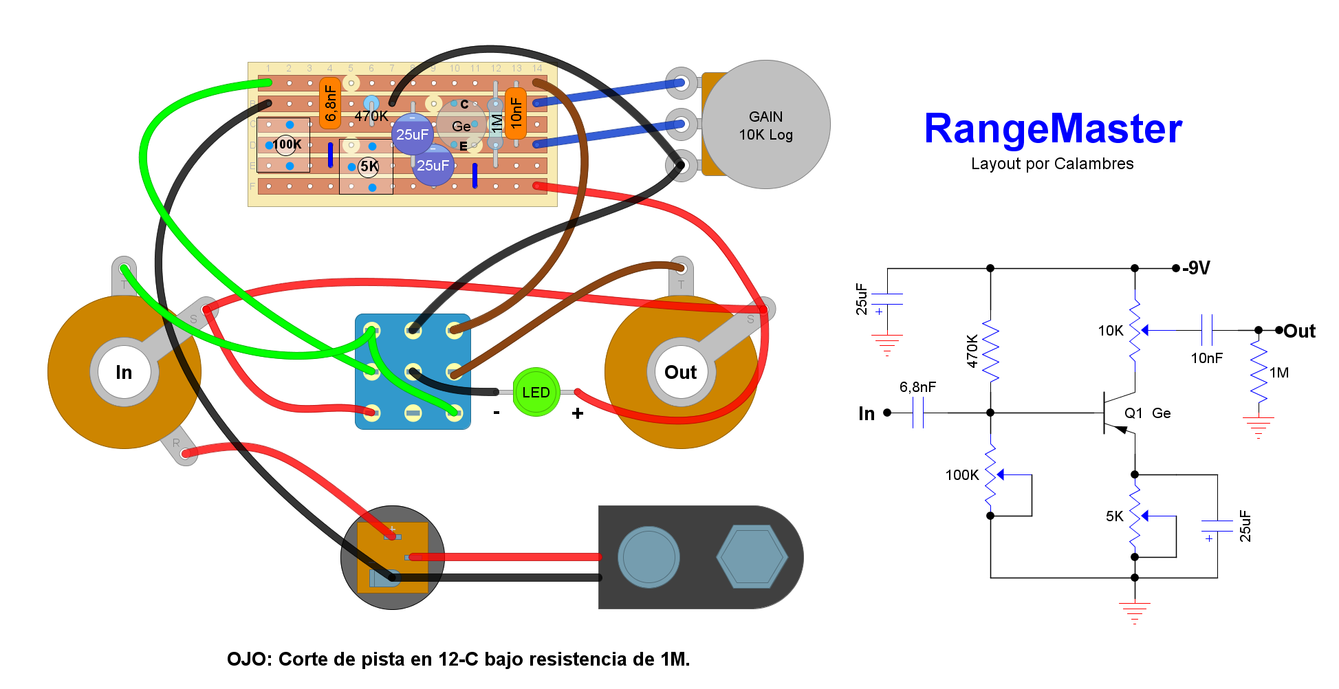 1.- El pote del RangeMaster "rasca". Lo siento pero es así y así ha de ser. La culpa es del propio diseño del circuito que permite que circule corriente contínua por él lo que le hace necesariamente "rascar". Es un coñazo pero has de vivir con ello si quieres usar el RangeMaster. Al fin y al cabo, tampoco lo estás tocando contínuamente en directo como si fuese un wah.