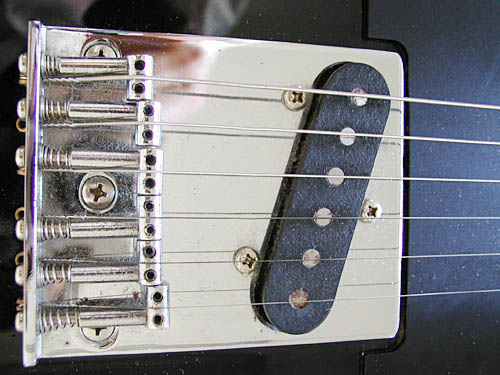 Este tipo depuente de seis silletas asimétricas cromadas, fue utilizado mucho por Fender en los años 80. Muchas Fender Japan de las buenas lo montaban, y también lo he visto en algún modelo USA, pero no me gustaba nada el que las cuerdas no atraviesen el cuepro, como debe ser en una telecaster tradicional que se precie...así que lo sustituiremos por un puente tipo vintage de tres silletas de latón, y montaremos bushings para el pase de cuerdas a través del cuerpo.