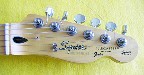 como ves, se trata de una Squier Telecaster by Fender de la serie Silver. Hecha en Japón en el año 91. Estas guitarras no estaban nada mal, sobre todo de mástil. El cuerpo no es nada del otro mundo. No lo he decapado, pero probablemente sea de basswood. Ligerito, pero poco resonante. Es lo peor del conjunto.