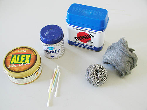 y formaron parte imprescindible en el trabajo unos bastoncillos de algodón de limpiar los oidos, cera incolora para madera, aguarrás, disolvente nitro, aceite de linaza, limpiametales, pulimento, un disco de gomaespuma para pulir ( de los que se acoplan al taladro), ácido nítrico, varios trapos de algodón, Ácido nítrico, betún de judea, varios pares de guantes de látex, y un par de brochas y pinceles.
