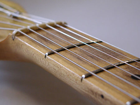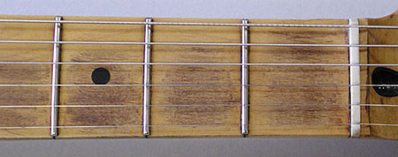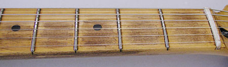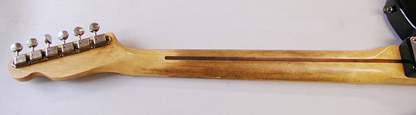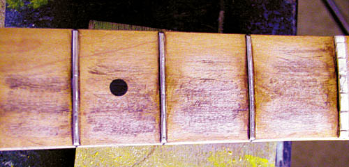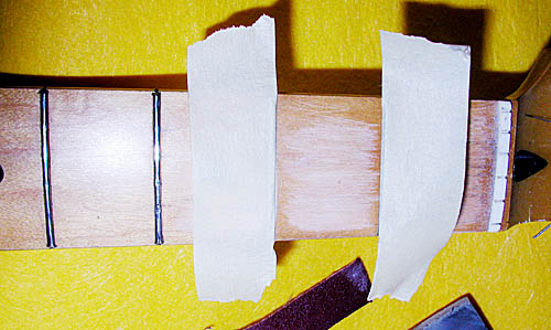 Así que la cinta de carrocero cumplió un papel fundamental para protegerlos, a la vez que iba erosionando las zonas que estimaba oportunas. Poco a poco iba manchando con betún de judea la madera, para así tener una "visión" más patente de lo que estaba consiguiendo. De hecho, interesaba ir ensuciando la madera en esas zonas, ya que cuando un mástil pierde el lacado, el diapasón se pone cada vez más sucio de la grasa de los dedos, el sudor...