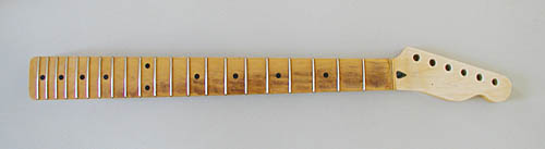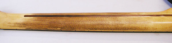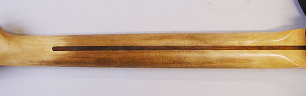 Con respecto a la parte trasera del mástil, el "relicado" consiste en eliminar el barniz en la zona donde más se toca, para ello empleé lija muy fina, lana de acero y un pedazo de cristal. Arañando con el cristal con un ángulo de unos 45º se consigue retirar parte del barniz, y a la vez bruñir la superficie de la madera, consiguiendo así un tacto bien sedoso y natural.