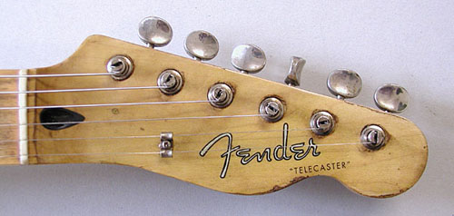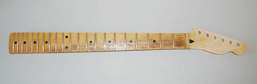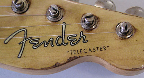 como ves, la pala está decapada...tuve que hacerlo para retirar el logo y número de serie de Squier, y para rellenar y restaurar un agujerito que hizo su anterior dueño para añadir un segundo retainer, que no era necesitario en absoluto. Coloqué un logo igual al que llevaría una Telecaster original de 1962, laqué con un barniz que amarilleé un poco, ..."reliqué" la pala en las zonas en las que habitualmente más se lleva golpes, monté el clavijero...y este fue el resultado: