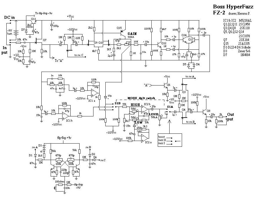 Cuando me di cuenta de este problema busqué el esquema para ver por qué esto era así. Que yo sepa no está disponible el esquema del FZ300 pero sí el del pedal que clona: