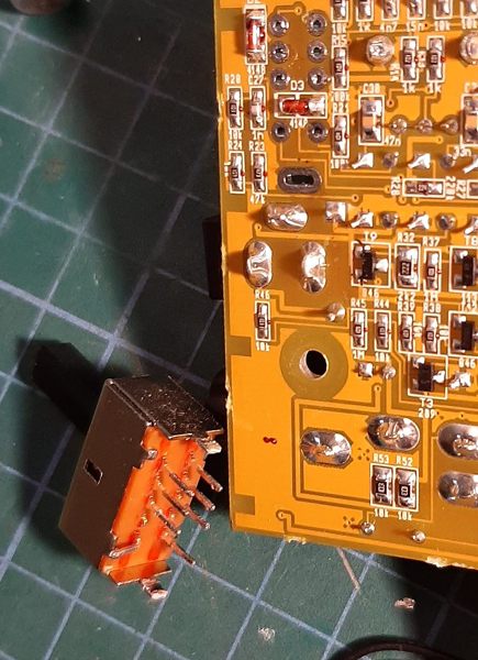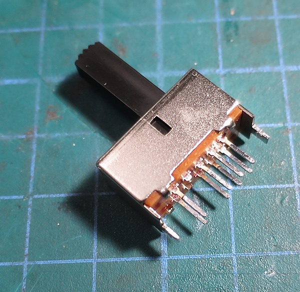 Como podéis ver, en la parte superior izquierda están los ojales correspondientes al switch DP3T (dos circuitos, tres posiciones). Cuando hice esta foto ya había desoldado el switch, que es justo donde está la dificultad del tema. Este switch no sólo lleva los 8 contactos, que de por sí son bastante fáciles de desoldar con malla, con "chupón" o con cualquier otro método más sofisticado. El problema es que la armadura del conmutador también está soldada a la placa mediante dos pestañas (ojales ovalados de arriba y abajo) y esto puede ser algo más difícil aunque con malla de desoldar y algo de maña tampoco es que sea nada del otro mundo. Fijáos en el switch una vez extraido: