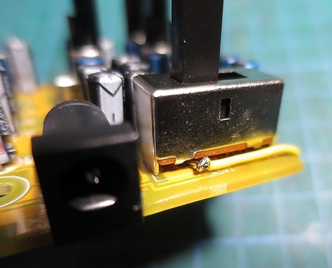 Tras esto debemos poner también un cablecillo uniendo el terminal "d" del conmutador con el terminal "a" o el "b", o con ambos, como hicimos antes. Da igual pues están unidos entre sí por el otro lado de la placa, bajo el cuerpo del switch:
