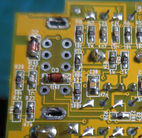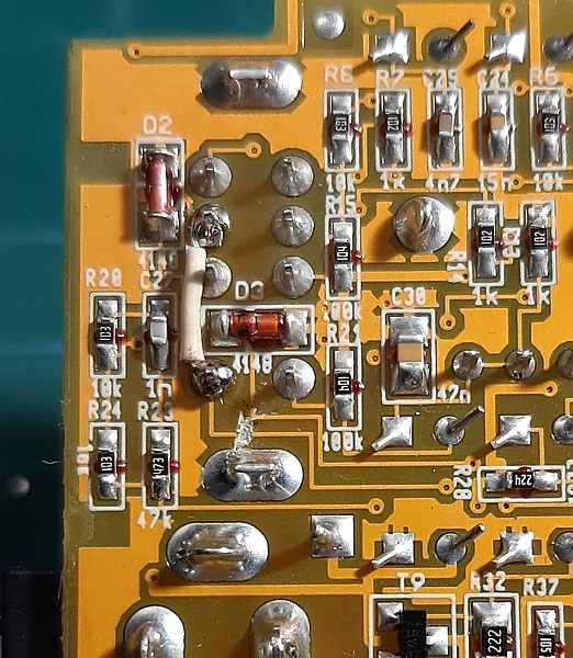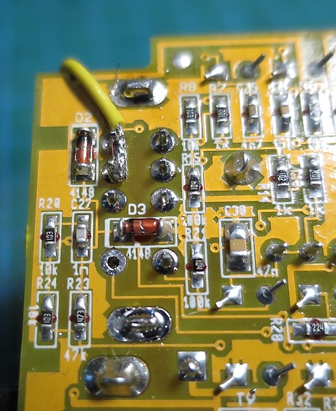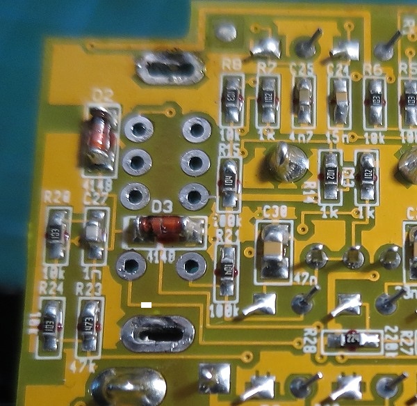 Como véis hice la foto después de quitar el switch pero supongamos que sigue allí, pues para esta modificación no tendréis que desoldarlo de su sitio. Necesitaremos cortar una pista de la placa. OJO que son pistas muy finas por lo que nos será fácil cortarla pero muy difícil rehacerla ya que además está lacada por encima. Se trata de cortar la pista que sale del ojal inferior izquierdo (correspondiente al terminal "d" antes visto) y lleva a una "vía" (unión vertical entre la capa superior de la placa y la inferior) que está justo donde pone "R28". Algo así:
