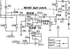 Analizando este esquema se puede ver fácilmente donde está el problema. El conmutador de modos S1 está dividido en dos secciones, la A (S1A) y la B (S1B). Fijaos bien en la parte del esquema que se refiere a la sección A de este conmutador, a continuación del control de voumen (LEVEL) que va inmediatamente después de la etapa de tonos: