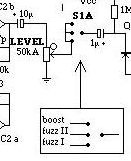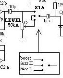 Si os fijáis bien en la leyenda de abajo, las posiciones están dibujadas justo al revés que el switch real del pedal, esto es, aquí la posición "FUZZ 1" es la de más abajo y la de "BOOST" la de más arriba. Pues bien, por algún motivo que no acabo de entender, la posición "BOOST" está sacada deliberadamente del control de LEVEL cuando las otras dos posiciones de fuzz sí que pasan por este potenciómetro de 50K Log. Dicho de otro modo, en esta posición es como si el control de LEVEL estuviese siempre al máximo, lo que provoca que siempre nos quede muy pasado de nivel. Para evitar esto la modificación es bien sencilla en teoría, pues sólo tenemos que cortar la unión entre el conector superior del potenciómetro y ese punto del switch a la vez que lo unimos a las otras dos posiciones de dicho switch, esto es, realmente anulamos esta mitad del DP3T pues en las tres posiciones la conexión es la misma. Sería algo así: