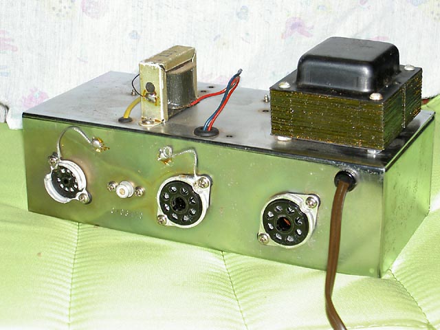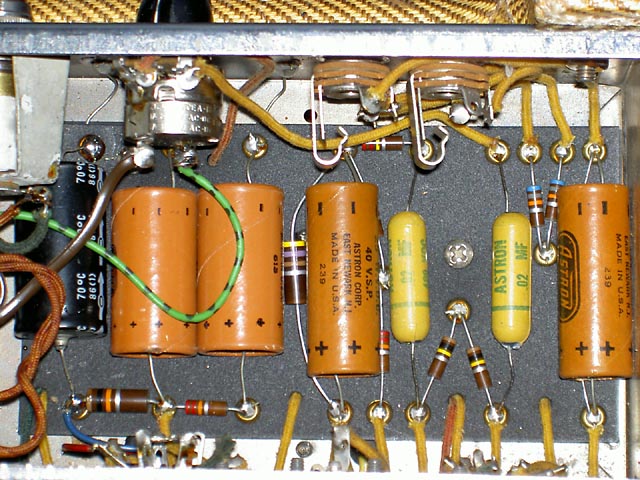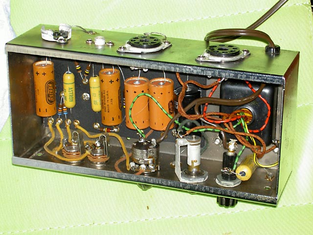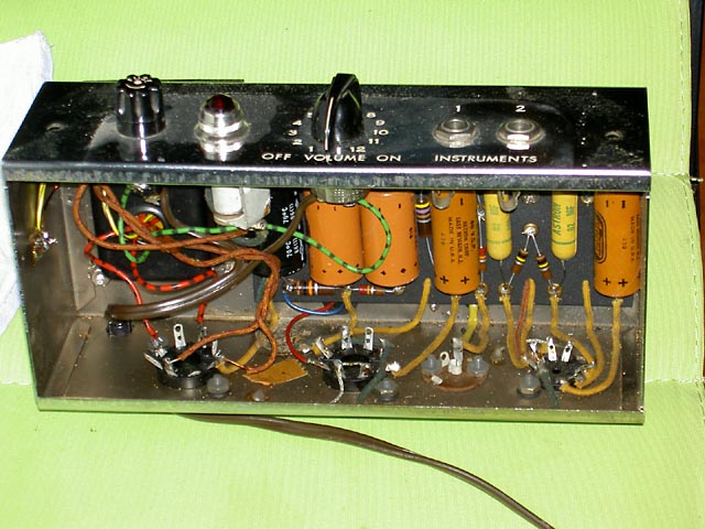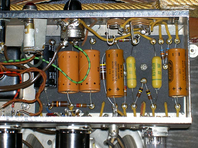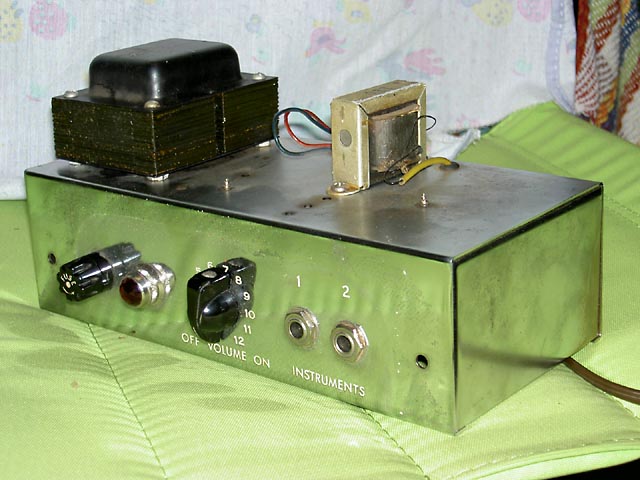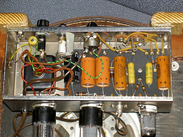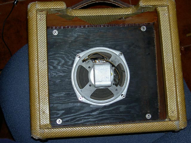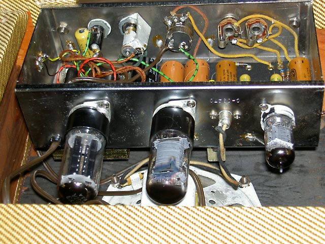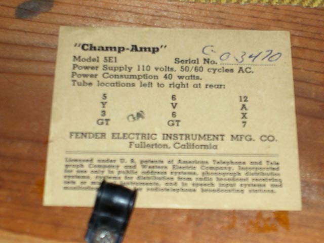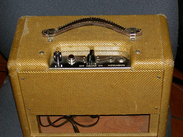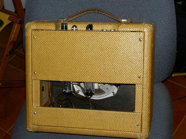 Se trata de un Champ original del año '57 que acompaña a una "Lapsteel" en un kit que se vendía para estudiantes. Este es el modelo "Narrow Panel Tweed" con altavoz de 6" y es un caso curioso de "transición" pues aunque el circuito es del tipo 5E1 y así se indica en la etiqueta que lleva pegada en el interior del mueble, carece del "choque" que llevaban los de ese modelo, siendo sustituido en este por una resistencia de 10K 2W tal y como se empezó a hacer en el siguiente modelo 5F1. Sí que lleva un condensador en paralelo con la resistencia de cátodo del primer triodo de la 12AX7, que es la otra diferencia fundemental con el posterior modelo 5F1.