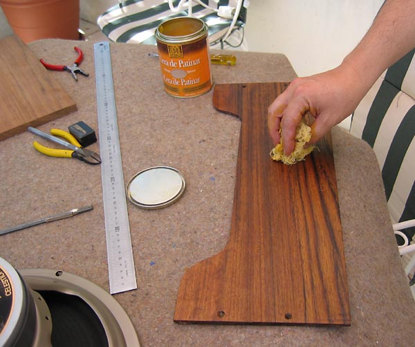 utilizamos "Cera de Patinar" de la marca Lakeone. Cualquier acabado que queráis servirá pero este es algo más fácil de aplicar que el barniz aunque más caro. Que quede claro que este tipo de acabado es algo "frágil" y que si pensáis darle buen tute al ampli sería mejor optar por otro tipo de acabado más resistente como el barniz. De todos modos es un producto muy bueno que da un aire muy bonito a la madera. De hecho os lo podéis fabricar vosotros mismos. Nos lo cuenta Rubén Hernández: