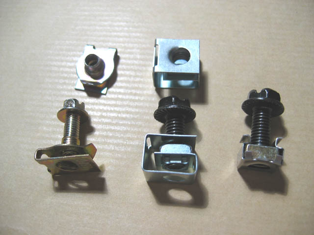 Como véis, está todo sujeto con cinta de carrocero sólo para colocar los componentes donde se pretendía que fuesen pues aún no estaban hechos los agujeros. Inmediatamente discutimos cual iba a ser el método de sujeción al mueble. Yo sugerí el utilizar "tuercas de jaula", que son las que se utilizan para fijar componentes a los "racks" normales:
