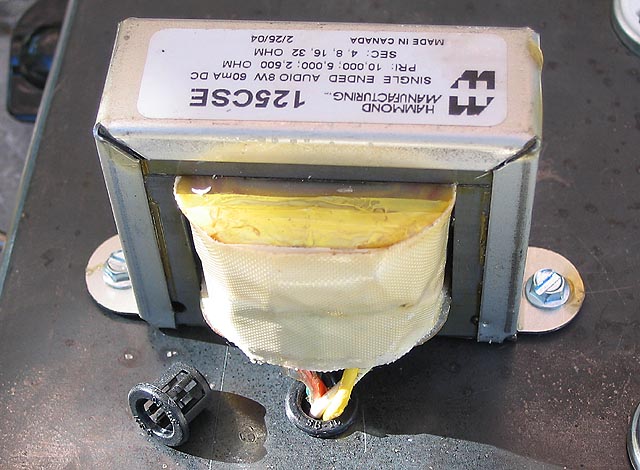 Para el paso de los cables del trafo de salida a través del chasis utilizé unos "pasacables" de plástico para evitar que con el tiempo se cortasen los aislamientos y hubiese cortocircuitos: