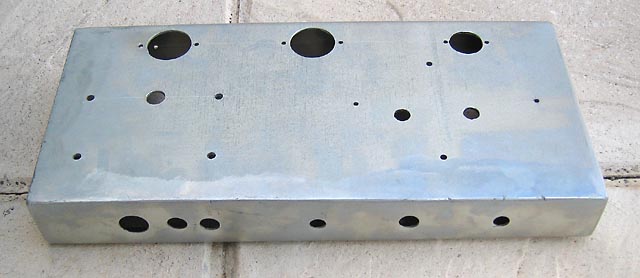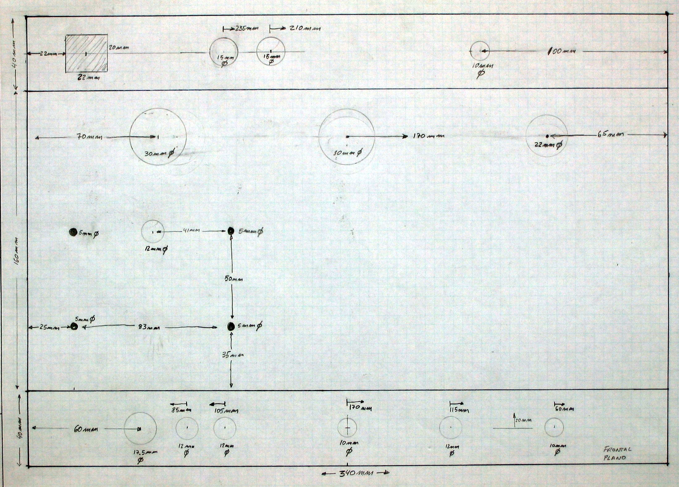 cotas de los taladros del chasis. El dibujo está a escala 1:1 y cada "cuadrito" equivale a 5mm. Si os fijáis bien, no aparecen los taladros del transformador de salida ni de los agujeros para sus cables. Este diseño lo hice antes de tener el trafo de salida y preferí hacer yo mismo sus taladros una vez que lo tuviese. Ahora bien, prestad atención...