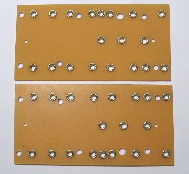 Las hice a partir de placa normal de baquelita para circuito impreso. No nos fué fácil conseguirla sin que tuviese un lado con cobre, así que una vez cortadas, las ataqué con cloruro férrico para eliminarlo del todo. Queríamos hacer algo similar a lo que Fender hizo con el Champ original con ojetes de latón. No pudimos encontrar ojetes del tamaño exacto del original así que tuvimos que optar por unos algo más grandes. A continuación explico con fotos todo el proceso: