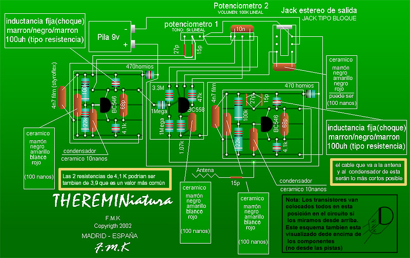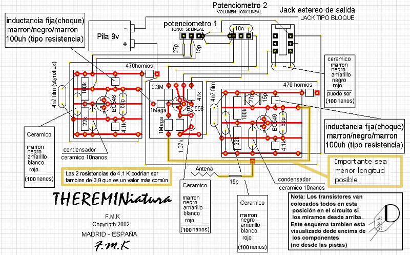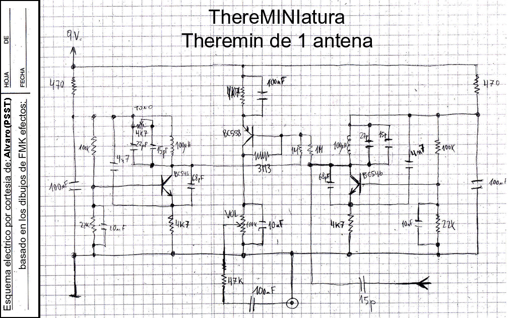 Aquí podéis ver el esquema teórico cortesía del amigo "psst". Al final de esta página podéis ver 3 fotos del precioso Theremini que se ha hecho.