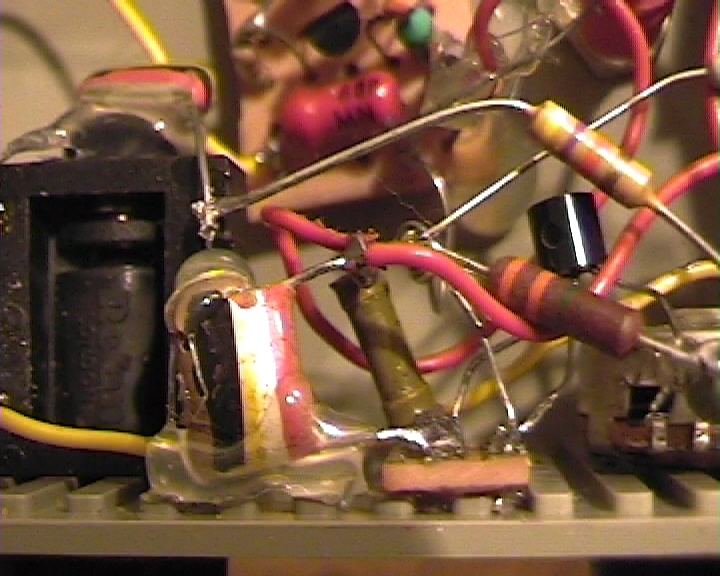 Al ser un efecto basado en fenómenos de "capacitancia", proximidades y demás puñetas hay que prestar mucho cuidado al posicionamiento de los componentes entre sí. Experimentad con diferentes posiciones. De hecho y por accidente se produjo un curioso efecto de "doble señal". Creo fué en parte por poner los componentes además de en posición vertical, más cercanos entre sí que en el original. En concreto los componentes que veo que producen esto son la resistencia de 470 ohmios y el condensador de 68picos. All aproximarlos entre si y/o a la inductancia fija (choque), en los sentidos que muestro en los recuadros rojo y azul de la siguiente imagen y en ambos circuitos (izquierdo y derecho) si es que el montaje lo hacéis en vertical.