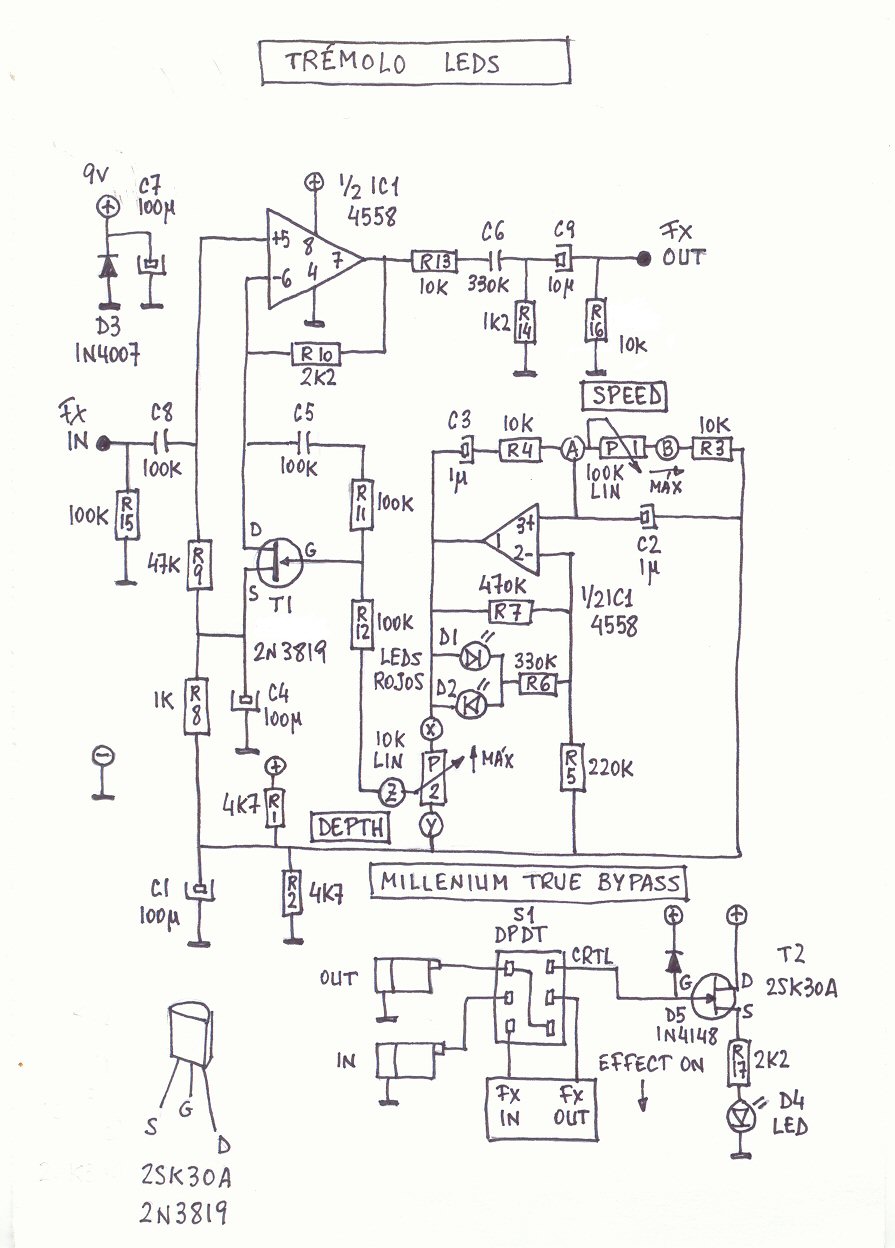 Ya sé que hay muchos esquemas de trémolos rodando por la red, pero éste tiene algunas características que lo hacen (al menos para mí) el más interesante. Por ejemplo, en vacío no hace ruido. No se oye ese molesto tac tac rítmico con el que nos regalan algunos pedales profesionales mientras nos estamos pensando qué acorde quedaría mejor. Porque ésa es otra. No se trata de un clon de ningún efecto comercial. Quizás eso os corte y penséis que no va a valer la pena. Allá vosotros. Yo os aseguro que el que lo monte no quedará decepcionado, y si es así, que les eche la culpa a los de Pisotones por publicar este artículo. El esquema lo saqué de una revista de electrónica del año del catapún (no sé si era Radiorama, Elektor o alguna de ésas). Por cierto, ¿dónde se habrán metido aquellos tipos que publicaban esquemas de pedales? La verdad, algunos artículos tenían resultados bastante decepcionantes, pero otros (como éste) eran cojonudos. Otro de los atractivos del montaje es la facilidad para conseguir los componentes y lo bien que salen de precio. Que nadie se asuste por los transistores 2SK30A. Podéis usar el 2N3819, que tiene, además, el mismo encapsulado. Sin embargo para T1 conviene usar el 2N3819, pues con el 2SK30A se produce una bajada de ganancia muy evidente cuando se compara con el otro.