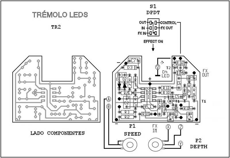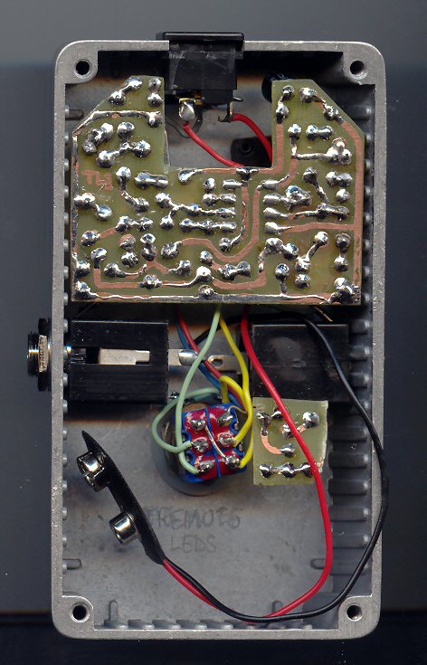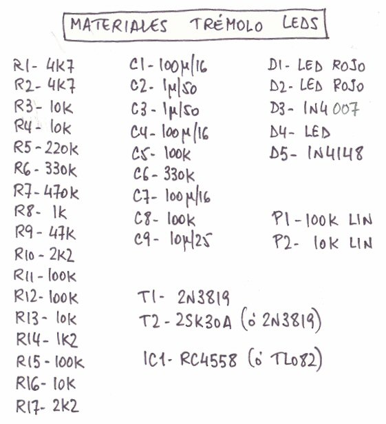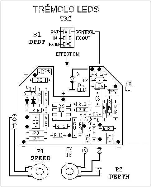 Vamos a ver un poquillo el circuito. Todos los trémolos que he visto funcionan de una manera similar (excepto los que están basados en integrados de la serie MN3xxx, pero éstos son otro rollo). La señal de la guitarra pasa por una etapa amplificadora o adaptadora de impedancias o lo que sea y, en un momento determinado, se ve afectada por la variación producida por un oscilador. Entre los componentes veréis que hay dos diodos LED. De ahí el nombre que le he puesto al circuito. En la lista de componentes no he puesto que pueden ser de 5 mm o de 3,5 mm (da igual) pero sí que he puesto que deben ser rojos. ¿Por qué? Pues porque así venían en el esquema original. Podéis probar con otro color pero si es por las lucecitas olvidaos porque, curiosamente, no se encienden nunca aunque el oscilador esté en marcha. El efecto sobre la señal de la guitarra puede ser más o menos intenso (pote P2-DEPTH) y la oscilación más o menos rápida (pote P1-SPEED).