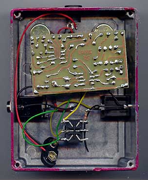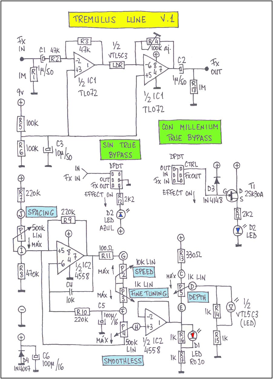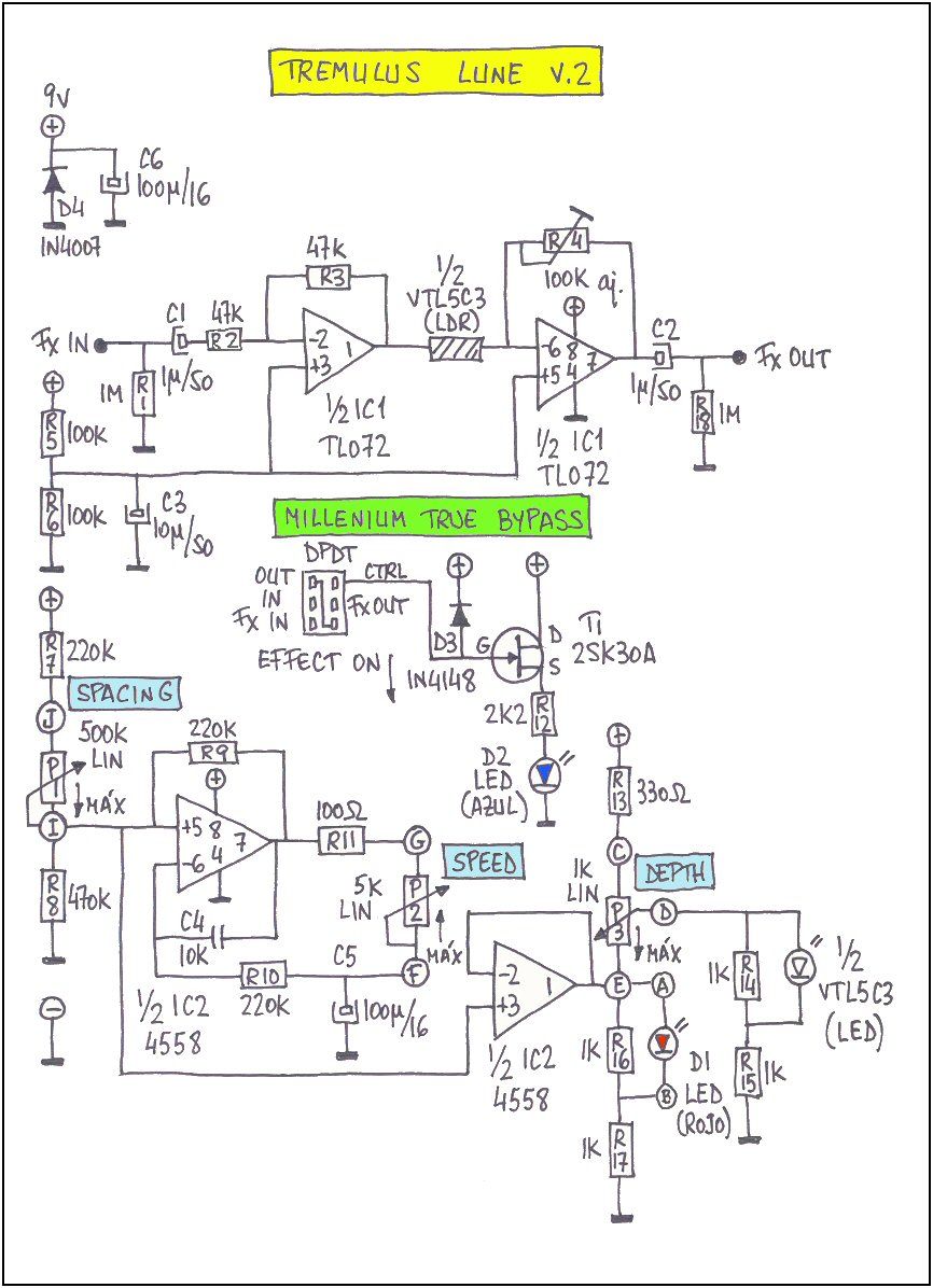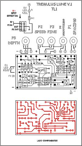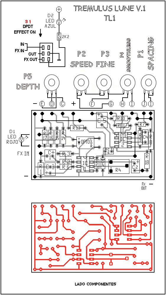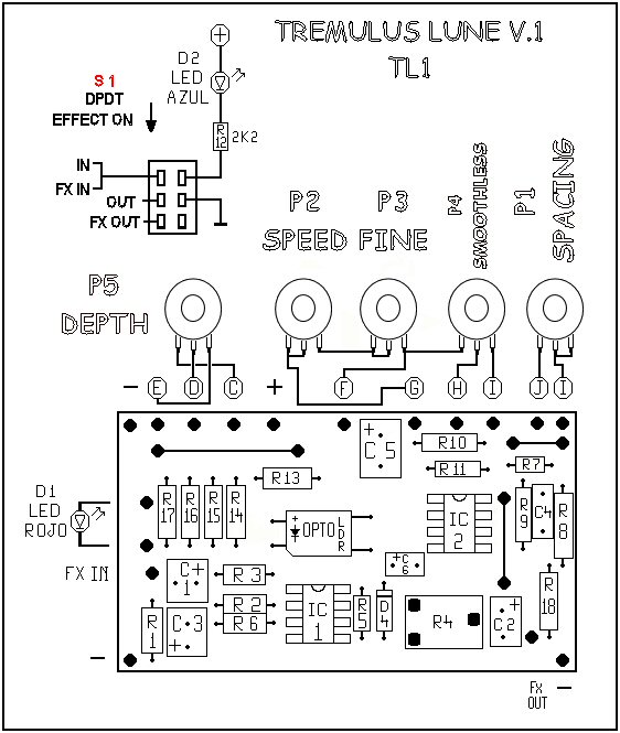 Hablando del led pulsante D1, cómo mola, oye. He hecho una pequeña modificación para que funcione siempre, aunque el efecto esté en bypass. De este modo sabemos antes de ponerlo a qué velocidad está girando el oscilador. Igual que en el EA Tremolo. Digo modificación porque en el esquema orginal estaba diseñado para que se encendiese al conectar el efecto; a mí me parece más útil si también se enciende cuando estamos en bypass, igual que en el EA Tremolo de Piso-tones. De hecho, me parece que es su UNICA utilidad, ya que una vez tenemos el efecto conectado no vamos a estar mirando como gilipollas cómo se enciende y se apaga mientras tocamos, ¿no?