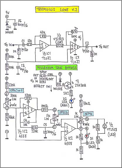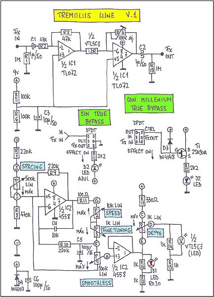 Se trata de un circuito de trémolo (no de vibrato) que yo calificaría de COJONUDO. No hace ruido, no se come agudos ni graves, es muy versátil y configurable; en fin, es de pila máster.