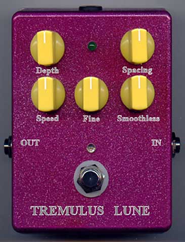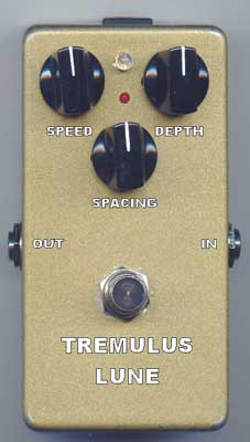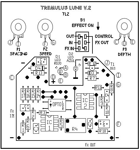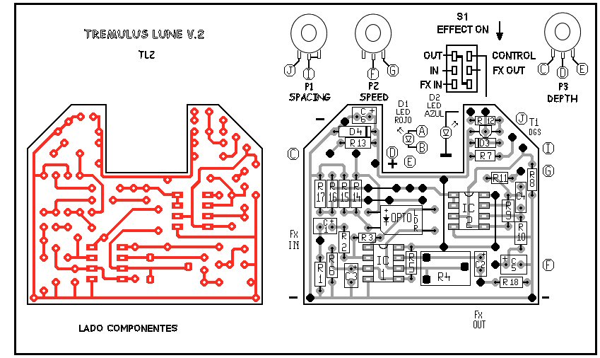 Continuemos con los potes. El de DEPTH (P5 en versión de 5 potes y P3 en la de 3) controla la profundidad del efecto. P1 es el control de SPACING ¿Mande? Os lo cuento: ya sabemos que un trémolo varía rítmicamente el volumen de la señal, es decir, que ese volumen varía entre un máximo y un mínimo. Pues bien, cuando P1 está al máximo, ese volumen mínimo es cero. La señal se corta por completo entre seno y seno del oscilador. Se nota muchísimo cuando el pote de Speed está en baja velocidad. A velocidades altas produce un efecto como de "metralleta", aunque es muy musical. Es lo mismo que ocurre en el Trémolo LEDs cuando el control de Depth está al máximo. A medida que vamos girando el control de Spacing hacia la izquierda, el volumen mínimo entre seno y seno del oscilador aumenta, lo que produce un trémolo más suave.