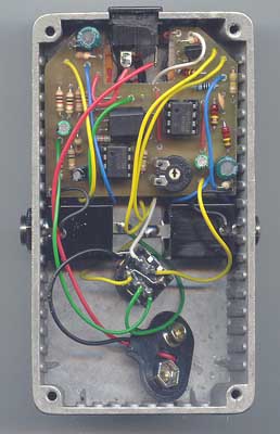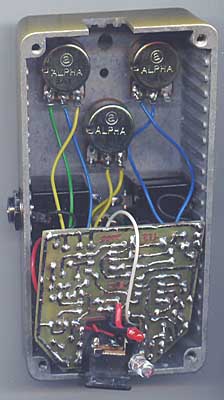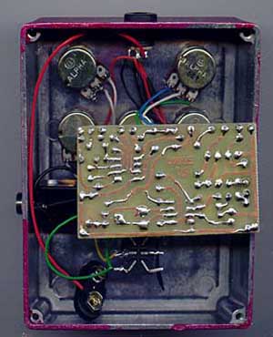 Lo segundo que quiero comentaros es que la versión original lleva 5 potenciómetros pero yo he hecho un invento para que sólo sean 3. De este modo, puedo meter el circuito en una caja Retex Ri-413. Os presento el circuito original y el circuito modificado. El original necesita una caja grande, tipo Hammond BB, como las que he usado en otros proyectos que podéis encontrar en esta misma página (Phase 90 y Fender Blender) Aquí os presento la versión 2 (la de los 3 potenciómetros) aunque la caja está por terminar y más abajo en esta misma página veréis la de 5 potenciómetros. Le he pintado de color dorado pero los letreros que veis son de mentirijillas. Todavía no tengo resuelto el tema del serigrafiado, así que, de momento, se queda como está. Estoy harto del habitual acabado innoble que caracteriza a mis pedales. En cambio, estoy muy satisfecho de cómo ha quedado el interior.