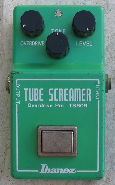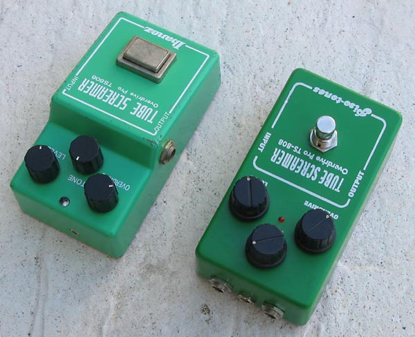 Hace muchos años mi amigo Alfonso, también forero de GORG, me prestó su recientemente adquirido y carísimo Ibanez TubeScreamer Overdrive Pro TS-808 japonés para que le reparase el conmutador de pie que estaba estropeado. Fijáos bien en el logo de "Ibanez" sin el "©", señal de que se trata de un ejemplar de finales de 1980 o de 1981. Tras repararlo se me ocurrió "echarlo a pelear" con mi TS-808 de Piso-tones. Lo hice utilizando "La Lupe". Puse uno de ellos en el bucle de la derecha y el otro en el bucle de la izquierda, la entrada general directa desde la guitarra y la salida general directa al amplificador. De este modo se puede conmutar de uno a otro instantaneamente con tan sólo pisar el switch, incluso en mitad de la interpretación, de un acorde, etc. Es la forma perfecta de comparar un pedal con otro.