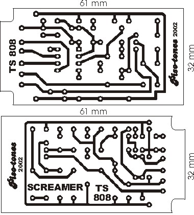 Una cosa muy importante y en la que "caen" casi todos los principiantes es en el fallo de poner la placa al revés a la hora de hacerla. Fijáos que en el dibujo del transfer pone "SCREAMER TS-808" (se ha quitado lo de "SCREAMER" en el dibujo de "componentes" por claridad). Eso está ahí para que os sirva de referencia. Una vez transferido al cobre se debe de leer bien, no al revés. Otra pista importante es el circuito integrado. Está en la mitad de la derecha del dibujo más o menos en el centro y un poco a la izquierda. Véis que hay 8 "pads" en forma más o menos de cuadrado y si os fijáis, el "pad" de arriba a la derecha es rectangular. Es el único "pad" rectangular de todo el circuito. Esta es una convención típica en los circuitos impresos e indica el pin nº1 del integrado. En el dibujo de componentes se representó el integrado completo. Fijáos que en la parte de arriba hay un rectangulillo que suele aparecer también en los auténticos chips. Otras veces viene indicado con forma de punto justo al lado del pin nº1.