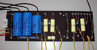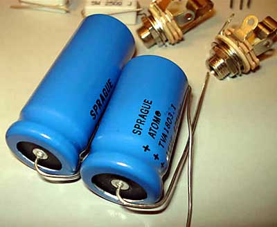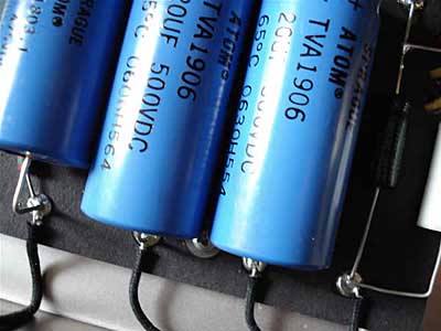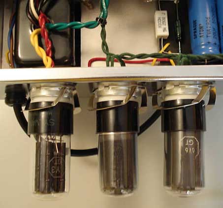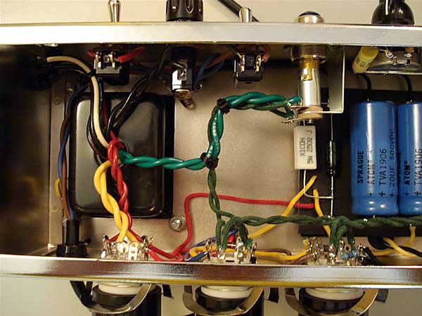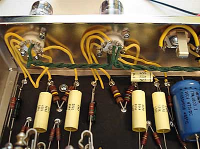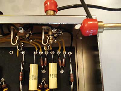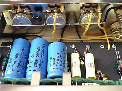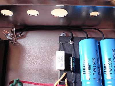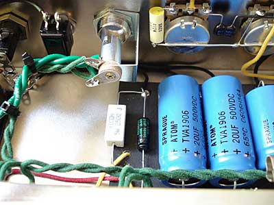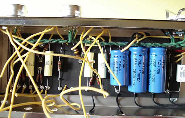 Estos son los condensadores de filtro. Su función es eliminar el componente de alterna (rizado) de la tensión que llega de la válvula rectificadora. De izquierda a derecha, son el filtro de placa (plate) de las 6V6, el de las rejillas de pantalla (screen grids) y el de las placas de la inversora de fase y del previo.