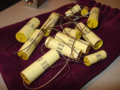 Condensadores Sozo hand made (los caros). Exteriormente son iguales que los "normales" excepto el de .022uF que tiene el logo impreso. La factura no era igual que los normales. Fijaos en la bolsita de fieltro púrpura...