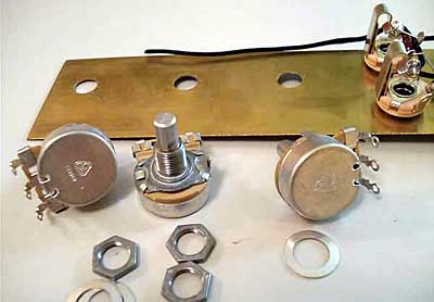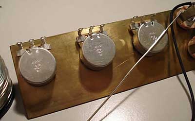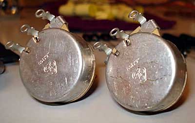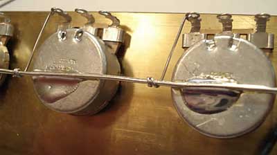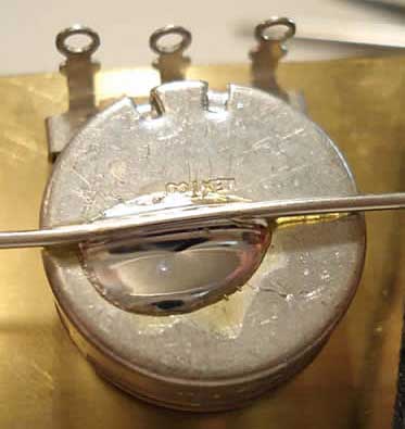 Primer pote soldado. Estos potenciómetros chupan el calor rápidamente y la soldadura queda sólida y limpia a la primera. Los potenciómetros CTS llevan una especie de barniz por la parte de detrás que hace que el estaño "resbale" y hay que estar aplicando calor el doble de tiempo. A veces hay que limar los CTS un poco para que el estaño agarre, lo que no pasa con los CGE.