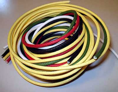 Estas eran las opciones que teníamos. A la izquierda, el de tela de tubedepot. En el centro, el sólido de tela "normal". A la derecha, cable trenzado con aislante de teflón, el que suelo usar yo normalmente y del que tengo "stock" en casa. Como queríamos una réplica estilo vintage, hemos usado el de tela, aunque hubo que hacer un pedido adicional.
