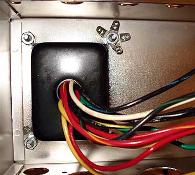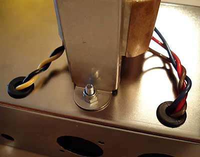Colocamos dos pasacables de goma en los agujeros correspondientes y trenzamos los cables del transformador de salida. El rojo, el azul y el marrón son el primario y deben ir en el lado del transformador de alimentación. El amarillo y el negro se conectarán a los jacks de salida, y van en el otro lado.