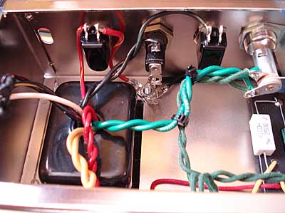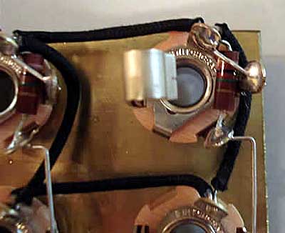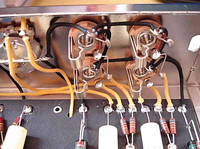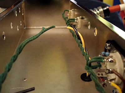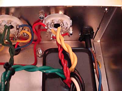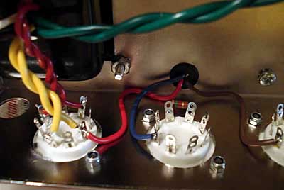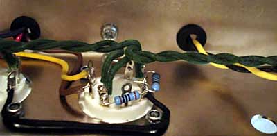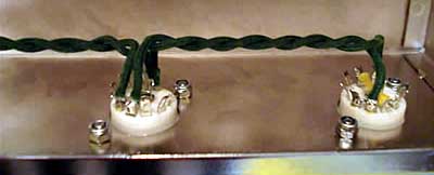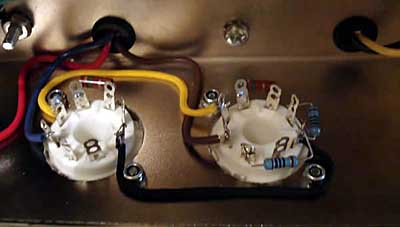 Foto del cableado de los jacks. Los cables a las resistencias de rejilla son bastante cortos. La marca Victoria suelda las resistencias directamente a los jacks, como hizo Fender a partir de los 60. En teoría es más efectivo soldar las resistencias de 68K directamente en los zócalos, pero en esto respetamos el layout original.