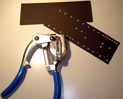 Lo primero es preparar la placa. Venía sin agujeros de montaje, y casi no me doy cuenta y empiezo a soldar, que es la primera tentación. Le hice los agujeros con un punch manual que compré para chasis metálicos. Lo hice un poco a ojímetro y no quedó mal.