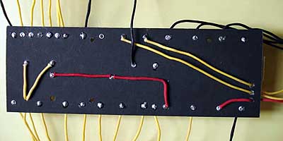 Esta es la placa vista desde arriba. He respetado el color amarillo de Fender, menos para los cables a masa (negro), y el de tensión que va a la rectificadora (rojo). Es importante soldar los cables a la vez que se sueldan los componentes, para aplicar el menor calor posible. También conviene usar disipadores de calor al soldar. Unas pinzas de cocodrilo sobre el cable del componente sirven.