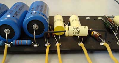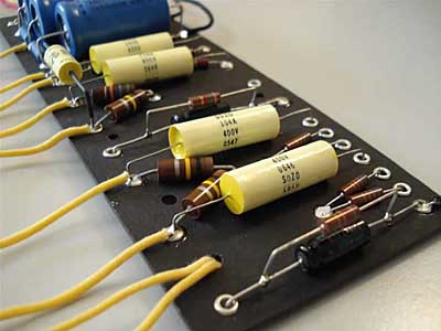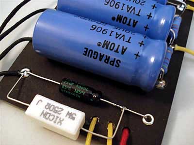 Los valores del circuito stock son tres de 16uF, pero he preferido aumentar el valor de los dos primeros a 20uF para que el ampli suene menos "aplastado" a volúmenes altos o en notas graves. Cuanto más fuerte tocamos más corriente demanda el amplificador, si estamos al máximo los valores vintage en los filtros a veces se quedan cortos. Los circuitos de los 40-50 fueron diseñados para tocar a volúmenes bajos, sin pensar que, 50 años después, la gente los iba a poner a tope todo el tiempo.