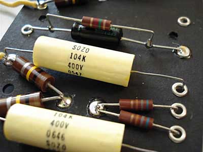 A la izquierda, las resistencias de 100K de placa de la 12AY7. Son Allen Bradley NOS de 1W. También se ven en detalle los Sozos de los caros.