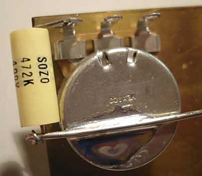 Condensador Sozo del pote de tono. Hago una buena conexión mecánica antes de soldar. Prefiero soldarlo al hilo en lugar de al pote directamente porque así le tengo que aplicar menos calor, aunque queden las terminales del condensador bastante cortas.