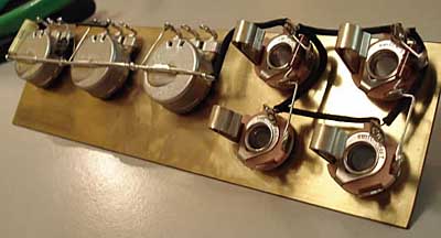 Los dos primeros filtros, la resistencia de cátodo y las masas del transformador de alimentación van a uno de los tornillos del trafo. Las masas del previo, inversora de fase y tercer filtro se conectan a la parte trasera de los potenciómetros. Las masas de todos los jacks van unidas entre sí. Uso la placa de latón que tengo en casa que me sobró de mi tweed deluxe para soldar con más comodidad fuera del chasis. No la vamos a usar, pero tiene las mismas dimensiones y los mismos agujeros que el chasis de TAD (el mío era Weber). Así evitamos que los restos del estaño salpiquen dentro del chasis, y el engorro de estar metiendo el soldador en un chasis tan estrecho.