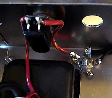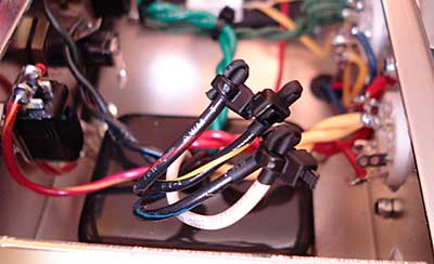 Aquí he colocado la luz del piloto, el portafusibles y el interruptor on/off. Sueldo los cables de los filamentos a los terminales de la lámpara, y coloco unas bridas para que no se muevan de su sitio.