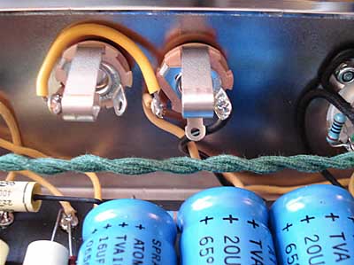Cableado de los potes. Fijaos en que los cables entre ellos los he colocado por debajo de la pestaña del chasis. El cable a la derecha, el que se mete por el agujero de la tarjeta de componentes es cable de señal y termina en el pin 2 de la inversora de fase. Mission y otras marcas de kits recomiendan usar cable coaxial aquí. Yo suelo esperar a escuchar el ampli encendido para tomar una decisión, porque hay veces que no tiene ruidos, y el cable coaxial quita un poco de "high end". Las distancias en los chasis de tweed son pequeñas, así que no suele haber problema y la verdad es que da bastante igual.
